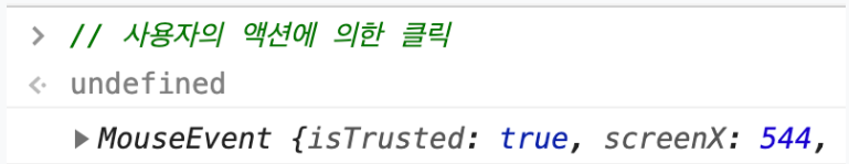 사용자가 요소를 직접 클릭하여 수행된 이벤트의 isTrusted 값은 true이다.